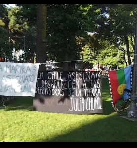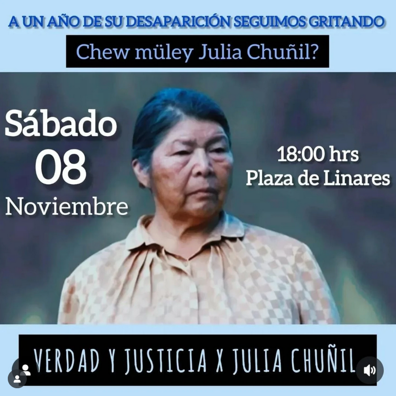 El sábado 08 de noviembre, al cumplir un año de la desaparición forzada de la lamngen papay Julia Chuñil Catricura, comunidades en Linares se movilizan exigiendo verdad y justicia en este delito/crimen que tiene a los habitantes de Chile en estado de zozobra y al país cuestionado nacional e internacionalmente. Así, a partir de las 18 horas, diversos colectivos se reunieron en la plaza de pueblo de Linares y desarrollaron una acción de memoria y visibilización, en un contexto donde el municipio ofreció “pan y circo”, ferias y fiestas en el espacio público; lo cual sirvió para llamar la atención de las y los transeúntes que aún desconocían el caso o, bien, mantenían dudas y falta de información.