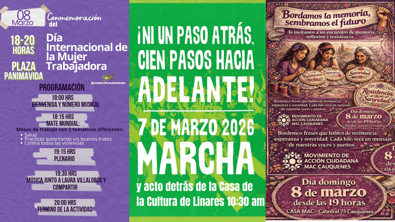En diversas comunas del Maule Sur se conmemorará el 8M: Día internacional de la mujer trabajadora. En esta publicación compartimos 3 actividades que observamos con mucho cariño, sentido crítico y admiración.