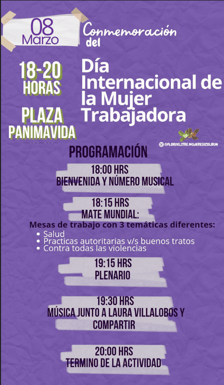 En Panimávida y Colbún la convocatoria será el 08 de marzo a las 18:00 horas en la plaza de Panimávida; “capital cultural y política” de la comuna como le llaman. Allí, la organización Flor De Litre, mujeres en movimento invitó a la comunidad a la acción que iniciará con un acto musical, político y cultural; para luego desarrollar actividades reflexivas, mesas con temáticas para la conversación y terminar con un compartir.