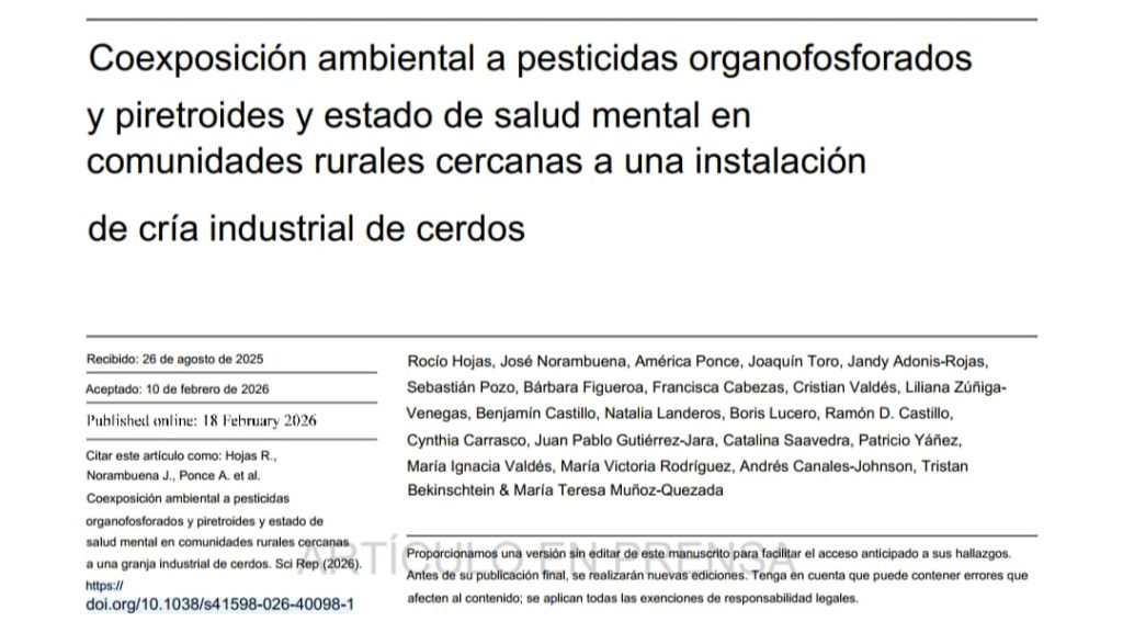 El 18 de febrero de 2026 fue publicado el informe científico “Coexposición ambiental a pesticidas organofosforados y piretroides; y estado de salud mental en comunidades rurales cercanas a una instalación de cría industrial de cerdos”, desarrollado por 23 investigadores a cargo de la profesora María Teresa Muñoz-Quezada como autora correspondiente.  Si bien se trata de una versión sin editar proporcionada para divulgar los principales hallazgos del estudio, la síntesis es clara y da cuenta de la relación existente entre la exposición a plaguicidas con enfermedades de salud mental en la población aduta-mayor, campesina y expuesta al veneno emanado en la industria criancera de cerdos en San Javier: la denunciada Coexca.